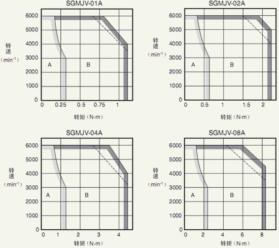 这些项目及转矩-转速特性值是与SGDV型伺服单元组合后运行时,电枢线圈温度为100°C时的值。其他是在20°C时的值。
